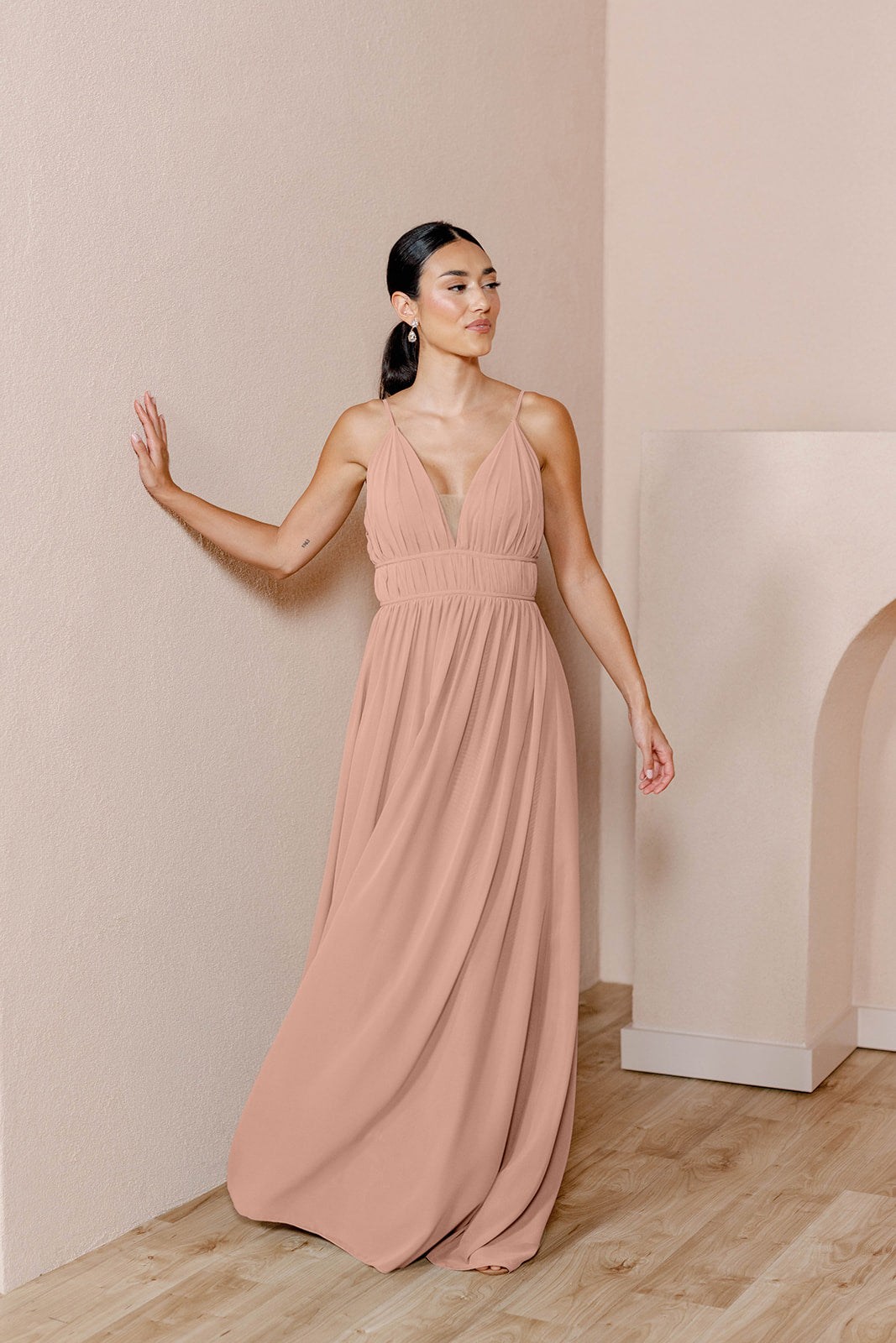 Our Alma dress is both a modern and romantic chiffon style that features a cute double waistline detail making it the dream dress for your big day! Alma is a modest style in her fit and has more coverage at the bust from the skin-tone illusion mesh design allowing her to flatter every body type. FEATURES: Flowing A-line silhouette Deep V-neckline Built-in bra cups and vertical boning for support Adjustable chiffon spaghetti straps Mid back zipper Full-length double lining for extra coverage *Does not have a slit in the skirt