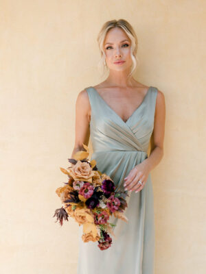Our Blair Satin dress is a timeless silhouette that everyone will want in their bridal lineup! This dress features stylized pleats that meet at the left side front of the waistline to help create a refined faux version of the widely known wrap dress accompanied by a modest slit. Blair is fit to flatter all types of figures and this modest style will still have you feeling confident and sexy all night long! FEATURES: Flowing faux-wrap silhouette V-neckline Built-in bra cups and vertical boning for support Thick shoulder straps Side zipper Front slit Full-length double lining for extra coverage