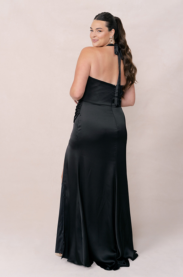 Enhance your bridal party with this modern and fitted version of a halter dress that will keep everyone looking! Our Fallon Satin dress features a halter neck that ties in the back with thick satin straps leaving your back open and is then finished with a delicate gathering at the waist on the left side of this dress to provide extra tummy coverage. Fallon pairs well with our Rory, Jade, and Dawson dresses. FEATURES: Fitted silhouette Halter top neckline Built-in bra cups and vertical boning for support Back zipper Slit on the left front of the skirt Full-length double lining for extra coverage