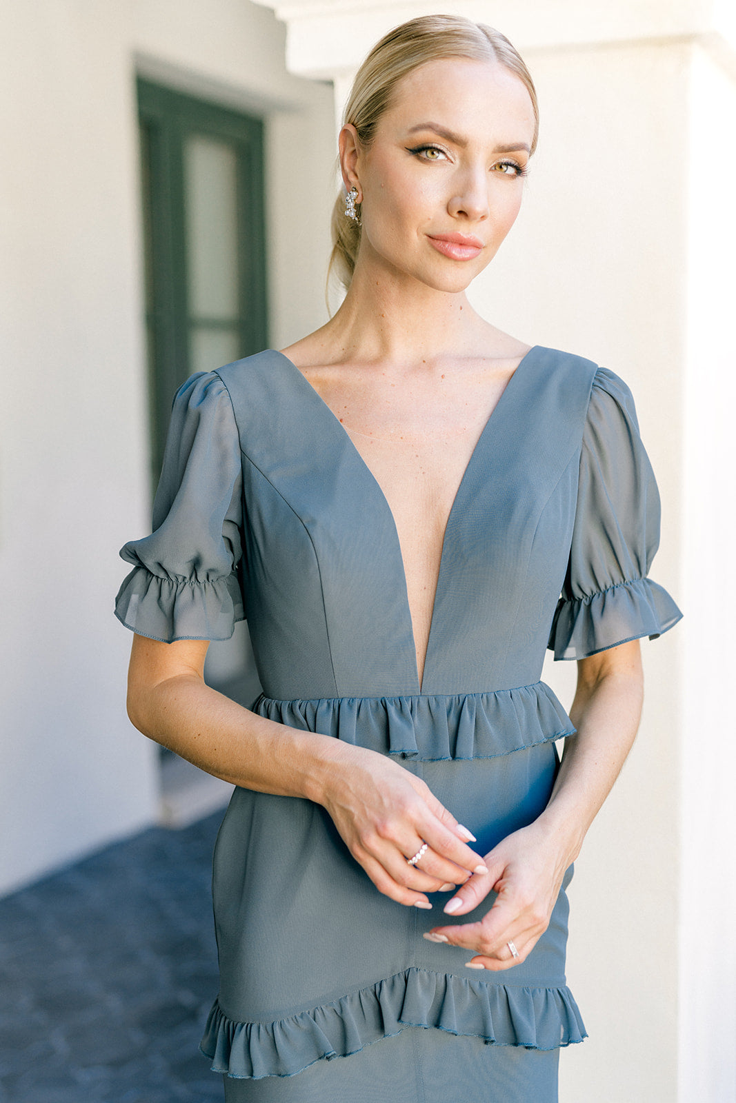 If you want to add something unique and playful to your wedding – look no further than our Harley Chiffon dress! Harley brings all the elements to life with its ruffled tiers, long translucent puff sleeves, and a plunging neckline with a skin-tone mesh illusion for more moderate coverage. FEATURES: Fitted silhouette Deep v-neckline Built-in bra cups and vertical boning for support Mid-length sleeves Back zipper Full-length double lining for extra coverage *This skirt does not have a slit