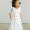 Our Rosalie Tulle dress is now even sweeter and available in our Kids collection! Rosalie Kids features a pleated bodice with a straight neckline for modest coverage, a self-tie tulle sash at the waist, and detachable off-the-shoulder sleeves. Convert the sleeves on and off with small buttons on the interior of the dress. Model Naveah; Size: 3T / Length: Regular, Age: 2, Height: 3’3 FEATURES: Flowy A-line silhouette Straight neckline Adjustable tulle spaghetti straps Back zipper Full-length double lining for extra coverage