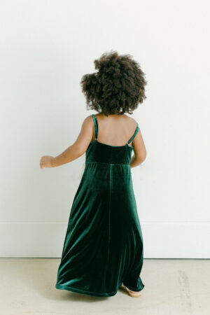 Our popular Skye Velvet dress now comes in our kids sizing and is a darling addition to match the bridal party! Kids Skye features a modest cowl neckline for more coverage and a simplistic silhouette perfect for any mini-me! Model Naveah; Size: 3T / Length: Regular, Age: 2, Height: 3’3 (measurements from 2021) FEATURES: A-line silhouette Cowl neckline Adjustable velvet spaghetti straps Side zipper Full-length double lining for extra coverage
