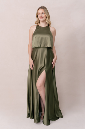 Our Wren Satin dress is an excellent contemporary style for the bridesmaid that is looking for something modest and simple, yet still fun in its details! Wren has a fully structured bodice with an attached flounce tank that flows into a flirty open-back design. This dress is finished off with a flowy modified A-line skirt, perfect to flatter any body type! FEATURES: Flowing A-line silhouette High neckline Built-in bra cups for support Thick shoulder straps Mid back zipper with a hook and eye closure at the neck Left side slit Full-length double lining for extra coverage